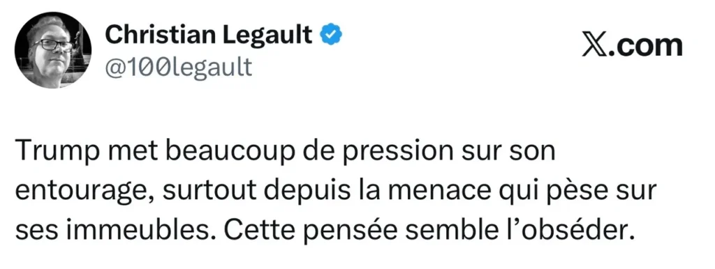Trump met beaucoup de pression sur son entourage, surtout depuis la menace qui pèse sur ses immeubles. Cette pensée semble l’obséder.