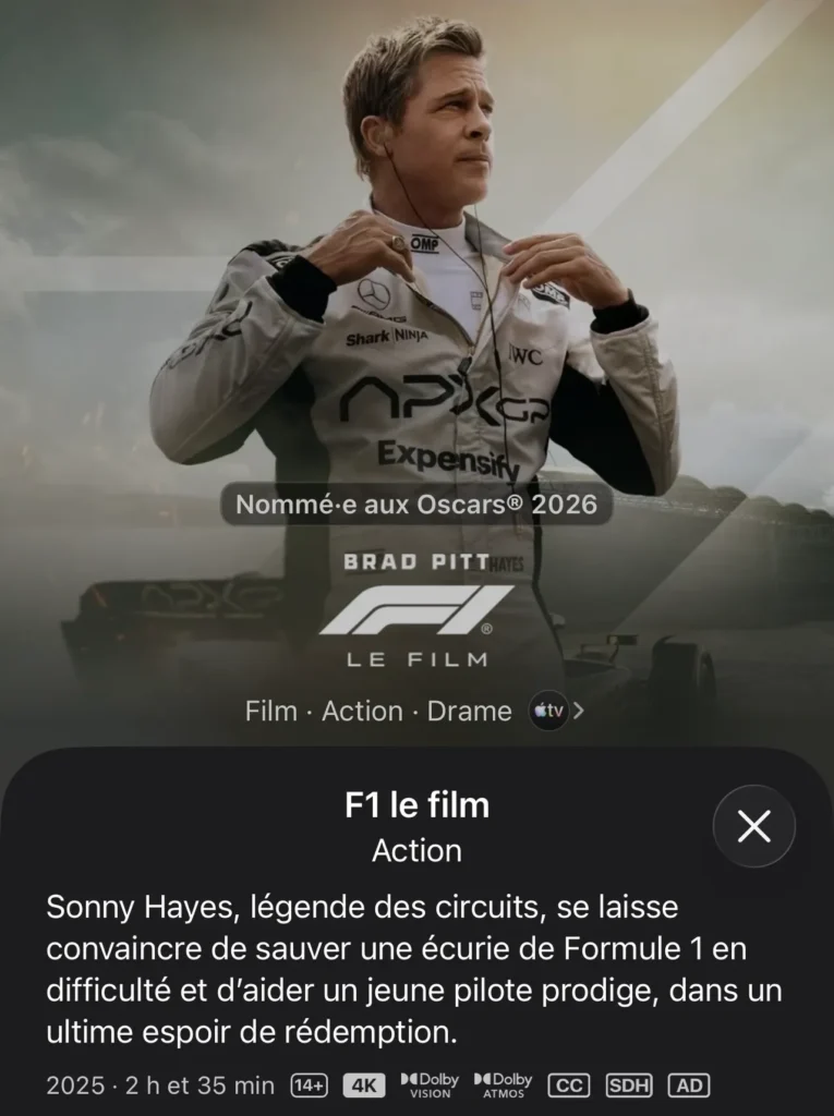 F1, le film, sur Apple TV+. J’ai bien aimé. Différent.