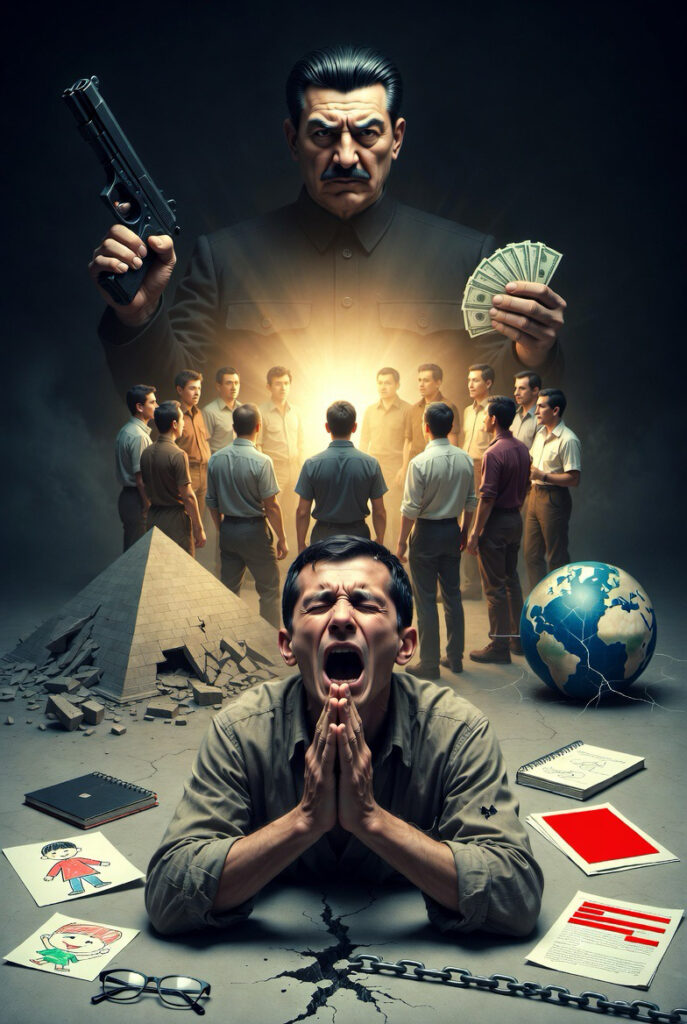 Women and children become objects of blackmail. To avoid symbolic castration, one must obey. This is yet another order visible through those « V » glasses. If you do not fear losing wife and child, perhaps you fit the profile of the one who « saves the widow and the orphan »? Whether out of personal conviction or to maintain social standing. At this point, I am the unworthy, isolated father, destined to be impoverished through overconsumption and fraud.