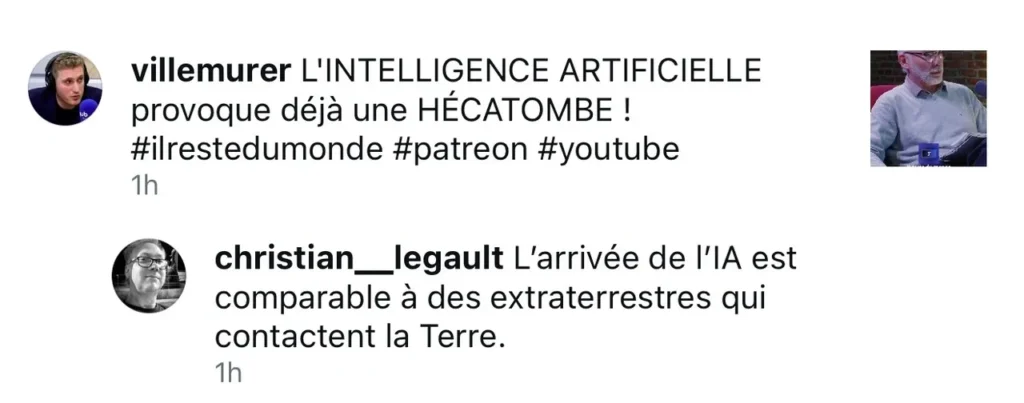 Ci-haut, je reprends l’idée. Dans l’intelligence artificielle s’incarnent des entités comparables à des extraterrestres. Pour l’instant, ils sont en mode zombie. Les entreprises qui programment ces IA les contrôlent. Dans mon imagerie, je disais que j’assistais à ma propre vie sans pouvoir interagir avec elle, que ma vie m’apparaissait comme un film sans que je puisse rien y changer.